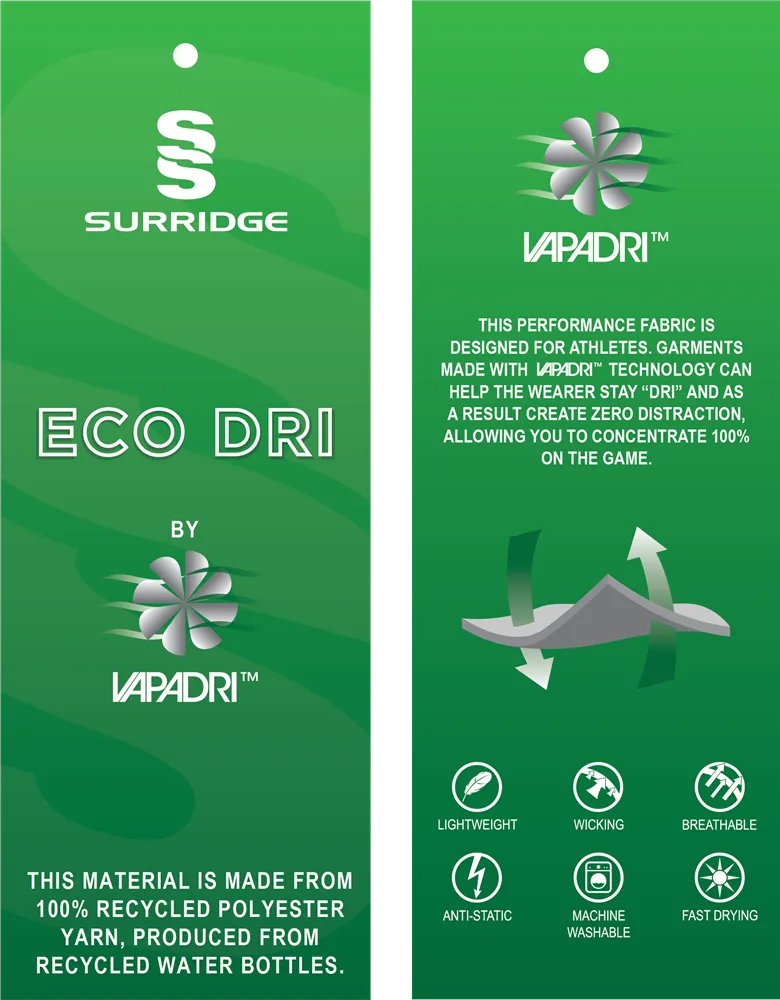 ECODRI is an exclusive range of materials made with VAPADRI technology for Surridge Sport and other major sports brands. EcoDri is a 100% recycled material that is used in the dye sublimated process for most playing garments. Surridge Sport can offer an Eco Dri material for all playing garments. At the moment the offering of the different textures is limited, but as the popularity increases and prices reduce then we are sure the different options will increase.